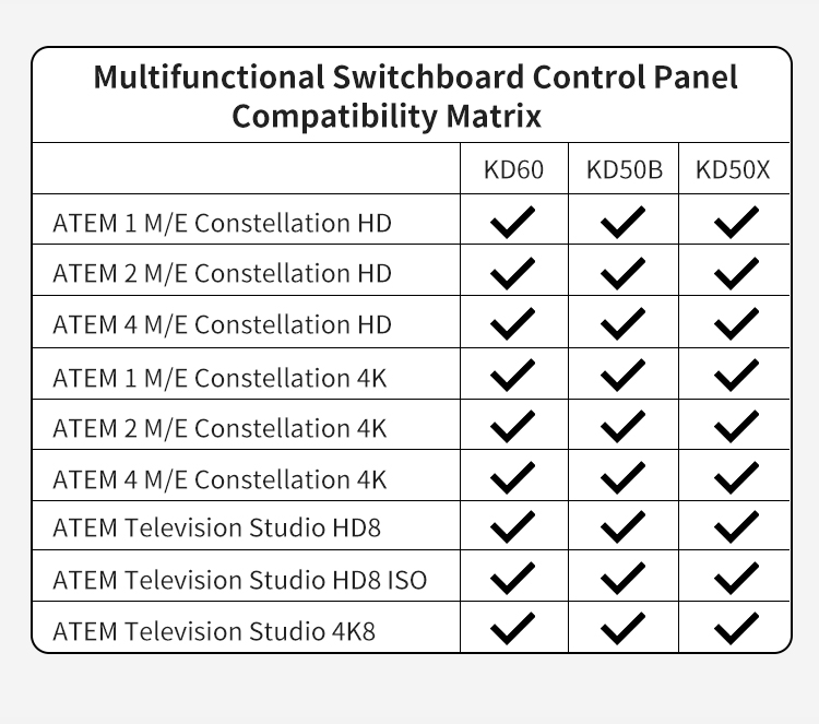 – Tích hợp điều khiển bộ chuyển mạch ATEM, điều chỉnh camera PTZ và trộn âm thanh trong một bảng điều khiển. Hỗ trợ chuyển mạch video 80 kênh (40 PGM + 40 PVW) với tổ hợp phím SHIFT để tăng hiệu quả sản xuất trực tiếp.