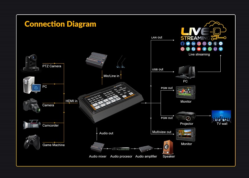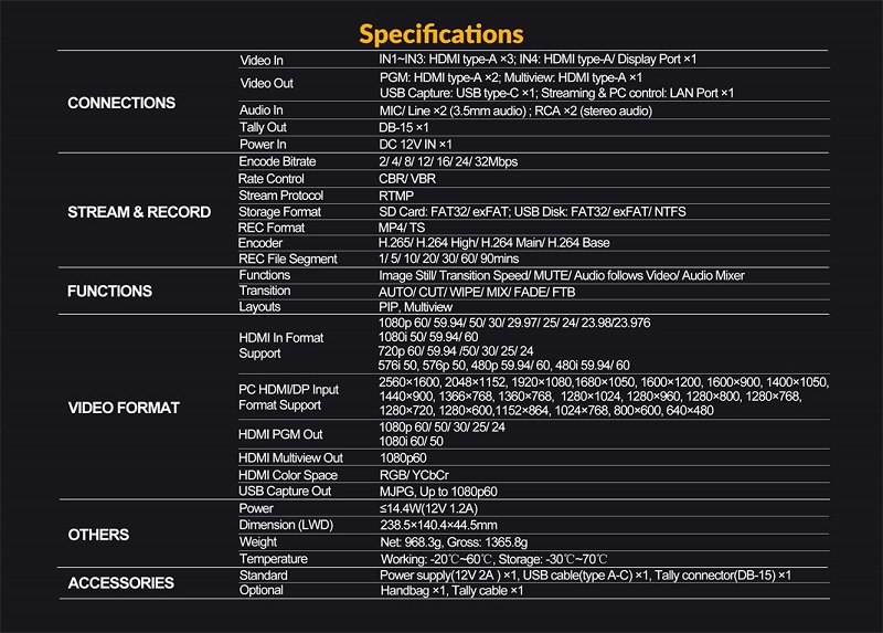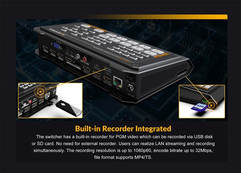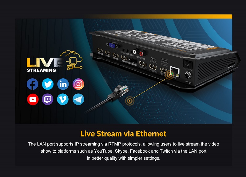 - Hỗ trợ truyền phát IP qua cổng LAN và giao thức RTMP, Tương thích với các nền tảng như YouTube, Skype, Facebook và Twitch