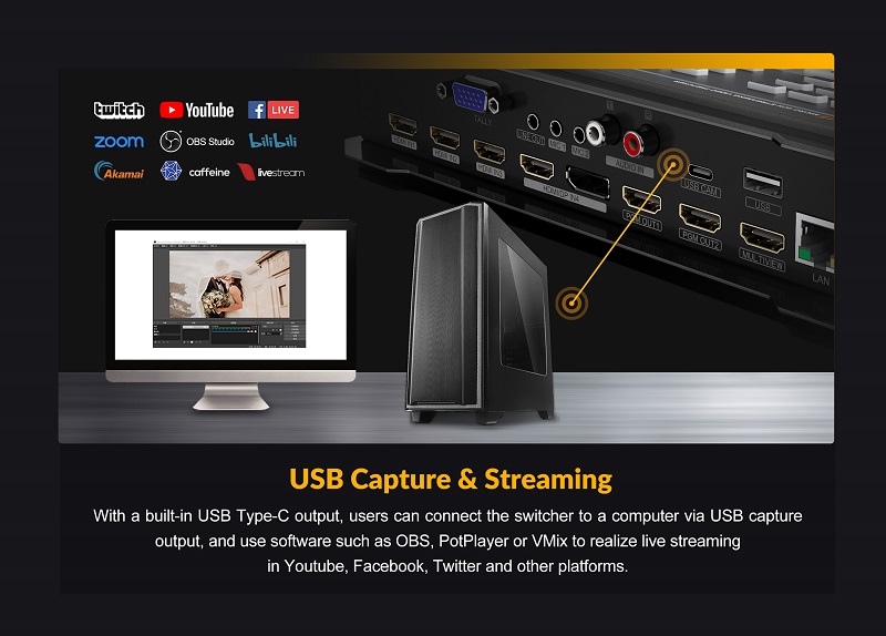 - Cổng USB-C tích hợp có thể được sử dụng để kết nối bộ chuyển đổi với máy tính để thu USB bằng phần mềm như OBS, PotPlayer hoặc vMix.