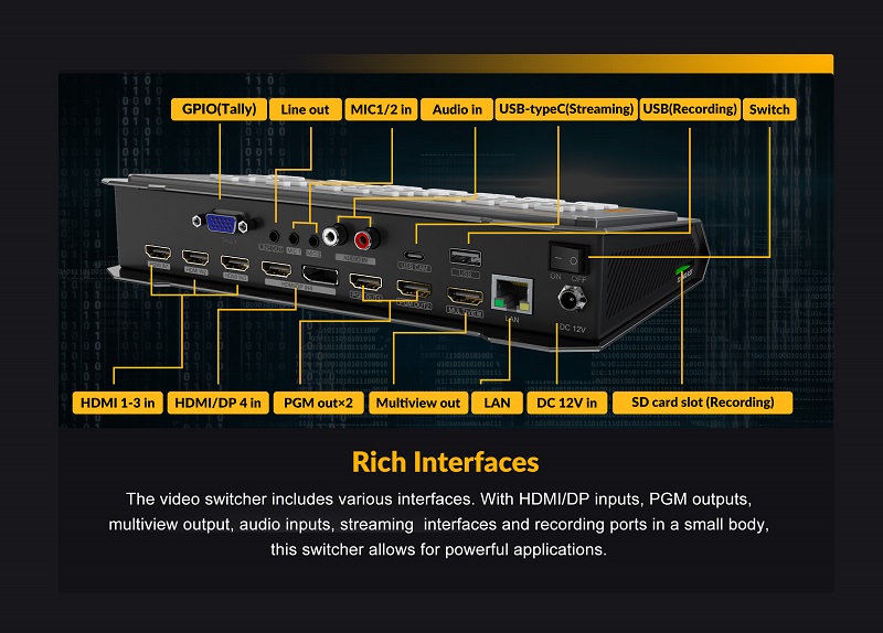 Nhiều giao diện bao gồm đầu vào HDMI và DisplayPort, đầu ra Chương trình, đầu ra nhiều chế độ xem, đầu vào âm thanh, cổng phát trực tuyến và ghi âm.