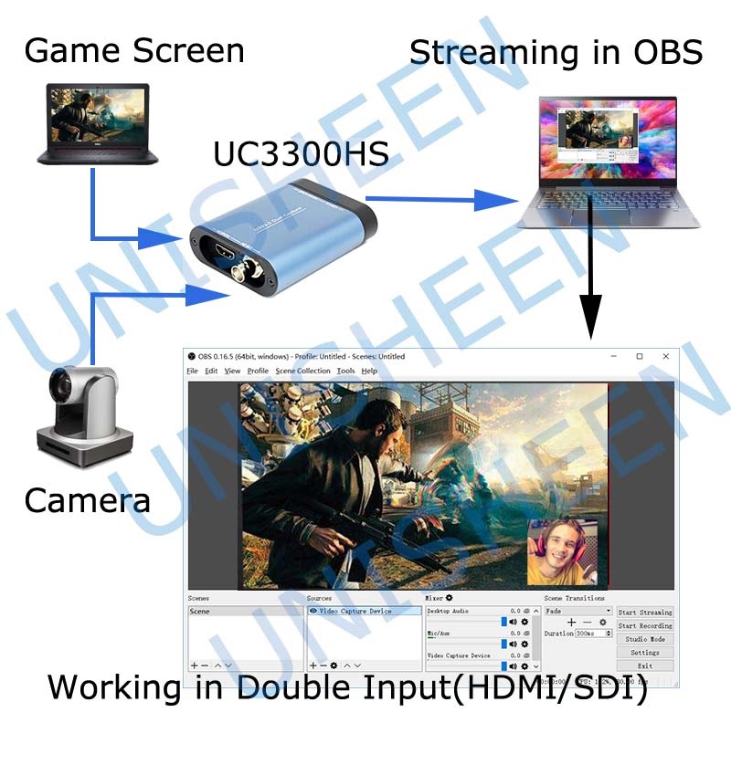 Box capture tín hiệu video Mã UC3300HS Có 1 Đầu vào HDMI ,1 đầu vào SDI (có thể sử dụng cắm song song) và đầu ra HDMI LOOP ( lặp lại tín hiệu HDMI vào) và 1 cổng kết nối USB 3.0 ( tương thích USB2.0).