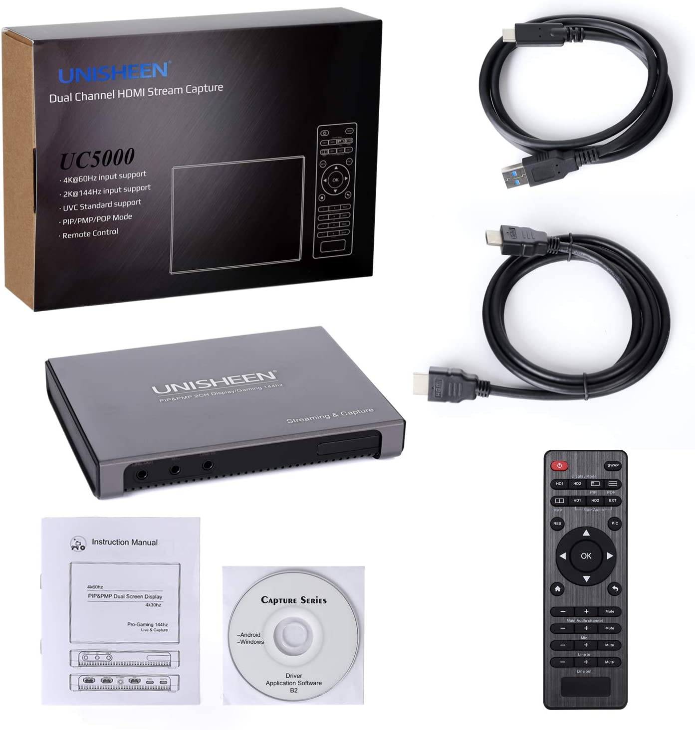 Box Capture livestream Unisheen UC5000 là thiết bị chuyển đổi tín hiệu từ 2 input HDMI sang USB 3.0 ,chuyển đổi input bằng điều khiển từ xa