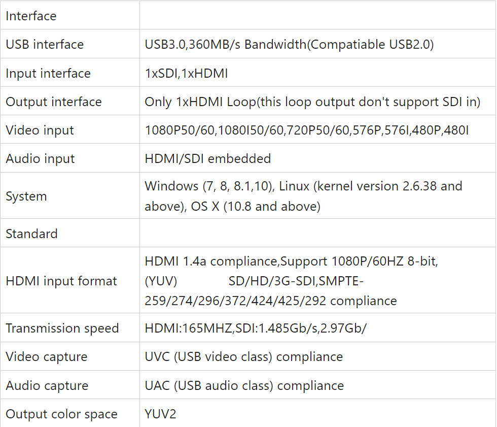 Tốc độ truyền | HDMI: 165MHZ, SDI: 1.485Gb / s ,2.97Gb / |