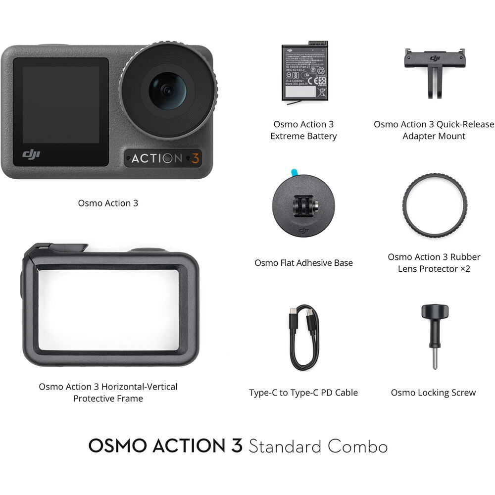 Osmo Action 3 Camera Standard Combo từ DJI giúp ghi lại cảnh quay ổn định, độ nét cao ở bất cứ nơi đâu bạn đến.Osmo Action 3 kết hợp những điểm tốt nhất của thế hệ trước: Osmo Action về hình thức và Action 2 về chức năng. Standard Combo này kết hợp camera Osmo Action 3 với pin dung lượng cao, giá đỡ từ tính 3 chấu, khung bảo vệ, hai miếng bảo vệ ống kính bằng cao su, giá đỡ bộ chuyển đổi tháo lắp nhanh, đế dính phẳng, vít khóa và cáp sạc USB-C.