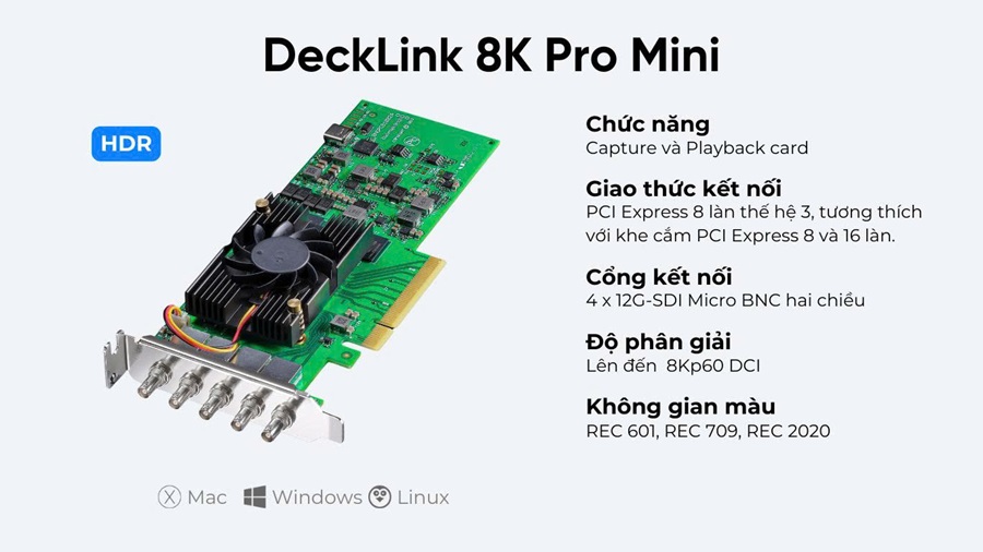 Capture Card DeckLink 8K Pro Minilà card thu và phát lại phim kỹ thuật số PCIe Gen2 8 làn có cấu hình thấp với bốn đầu nối micro-BNC 12G-SDI hai chiều chấp nhận độ phân giải từ SD, DCI 4K (4096 x 2160) và DCI 8K ở tốc độ lên đến 60 fps. Card hỗ trợ YUV 8 và 10 bit cũng như màu RGB 8, 10 và 12 bit.