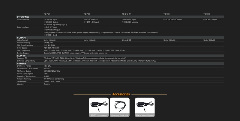 4. Docking Station TB-P30 : 2 x 3G-SDI output , 1 x HDMI 1.4 Output ( Video format up to 1080p60 )