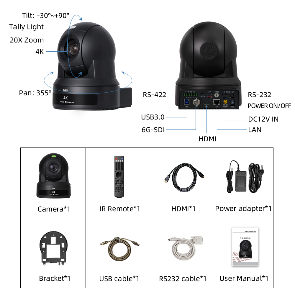 Hỗ trợ đầy đủ HDMI+6G-SDI +IP video+USB3.0 giao diện đầu ra video, giao diện IP hỗ trợ POE+.