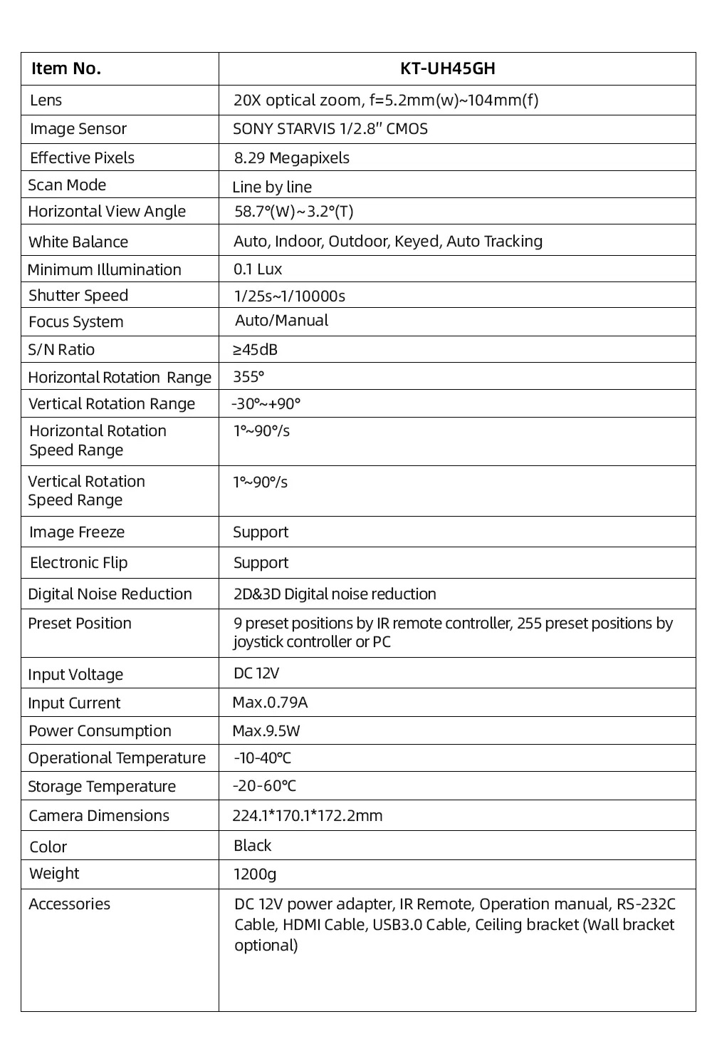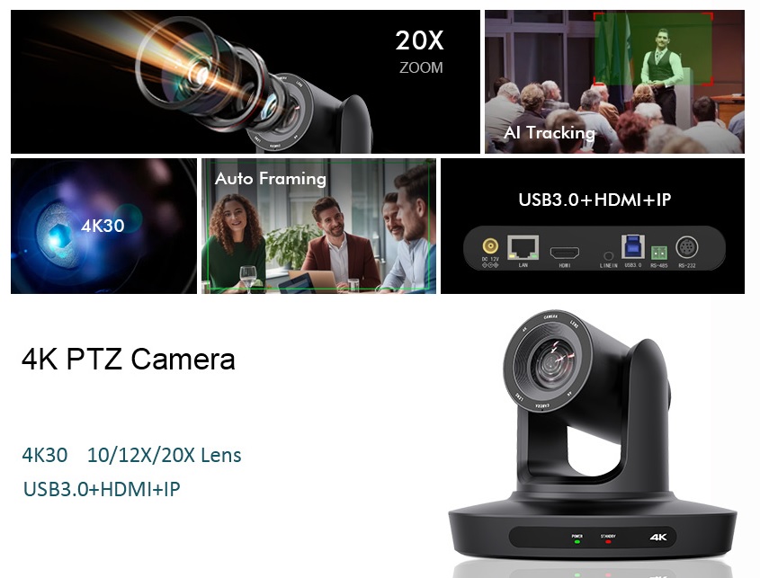 Camera PTZ 4K AI Tracking KATO KT-UH45GH Zoom 20X cảm biến CMOS SONY 1/2.8”, 8,50 Megapixel, độ phân giải cao tối đa 4K (3840x2160) với tốc độ khung hình lên tới 4K 30fps.Zoom quang học 20x, góc rộng 58,7 độ .