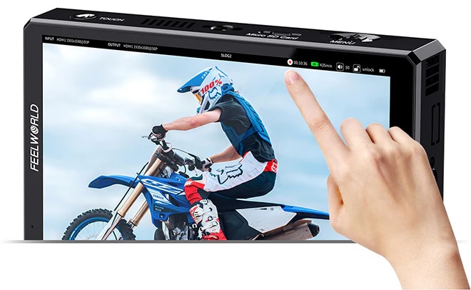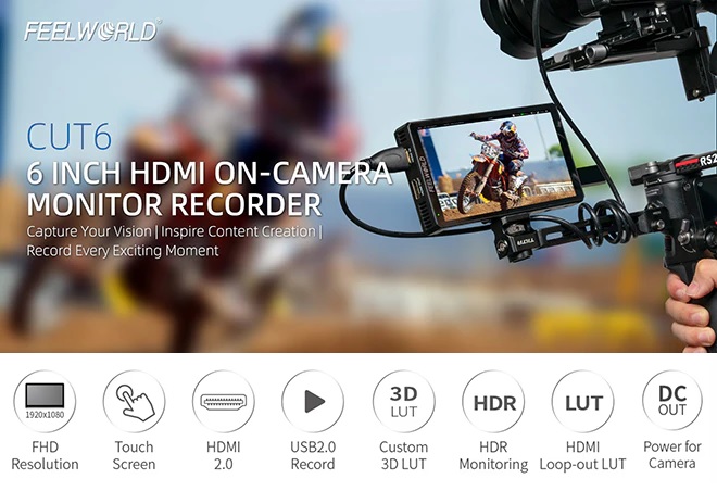 FeelWorld CUT6 6" 4K HDMI Touchscreen Recorder/Monitor để xem và ghi lại video HDMI lên đến 1080p30 với LUT được áp dụng. CUT6 có thể cấp nguồn cho một số máy quay thông qua đầu ra barrel 8.4V. CUT6 có màn hình cảm ứng 6" 1920 x 1080, một đầu vào HDMI 2.0 và một đầu ra vòng lặp HDMI 1.4 hỗ trợ video có độ phân giải lên đến 1080p60. Giắc cắm tai nghe 3.5mm cũng được cung cấp để theo dõi âm thanh trên phim trường.