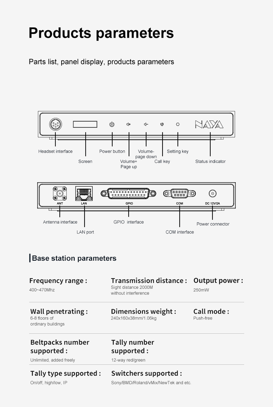 Bộ Tally Intercom NAYA BS180 là hệ thống liên lạc Intercom chuyên nghiệp trong điện ảnh và truyền hình. Bộ Tally Intercom NAYA BS180 là một hệ thống liên lạc song công 2 chiều (có 2 kênh thoại riêng biệt ). Thiết bị cho phép liên lạc nội bộ các thành viên trong ekip nhịp nhàng và chuyên nghiệp.Có kênh liên lạc mở rộng và kênh dành riêng cho lệnh riêng biệt, đảm bảo người chỉ huy có thể ra lệnh bất cứ lúc nào mà không phải chờ đợi.